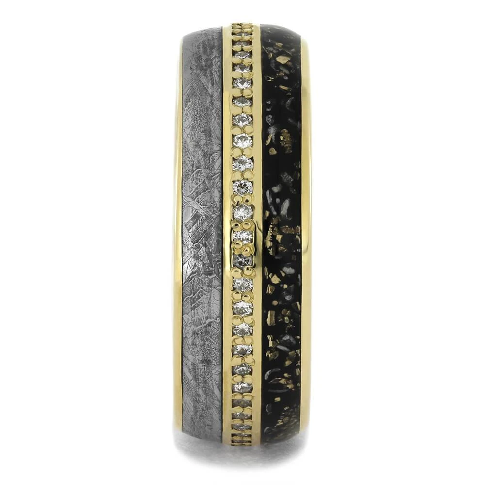 This stellar eternity ring features genuine, Gibeon meteorite and our unique stardust material that’s created from enamel with sprinkles of gold and meteorite dust nestled inside. A meteorite wedding band is an extraordinary men’s or women’s ring, perfect for symbolizing your love. Every piece of meteorite and has a unique pattern, making your eternity wedding band one-of-a-kind!
