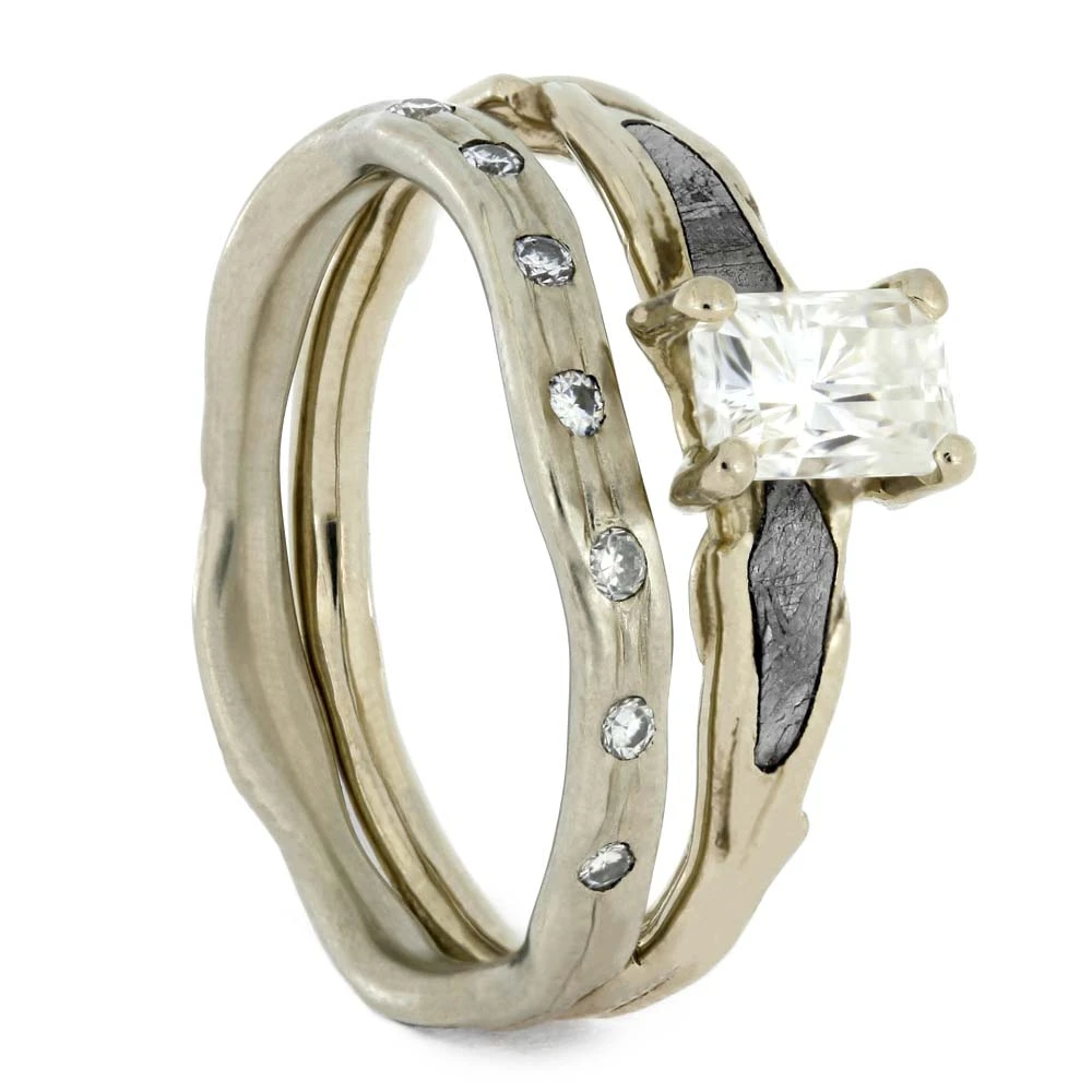 This stunning ring set features an emerald cut moissanite that boasts an abundance of sparkle. It’s carefully crafted in white gold and has meteorite inlays in the branch-style band. A coordinating band with flush set, round cut moissanites completes the extraordinary pair of rings.