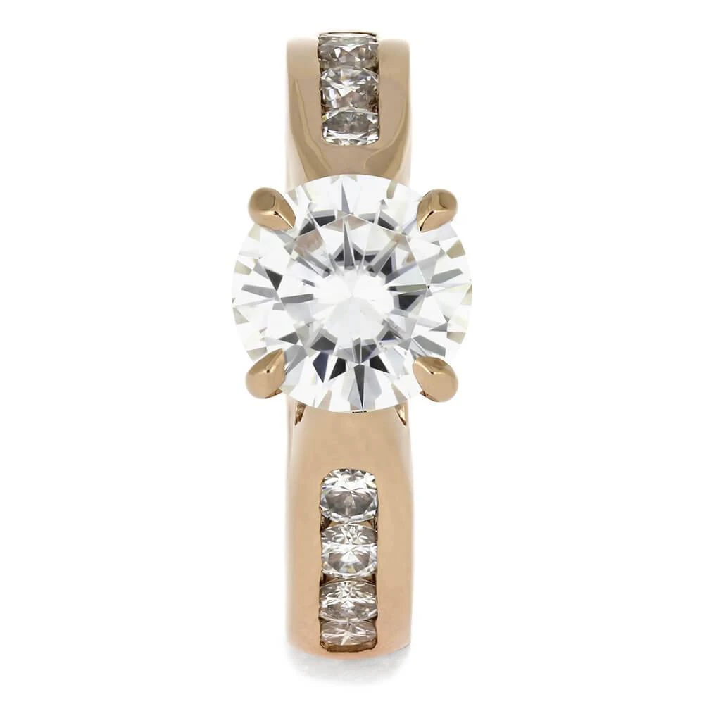 With a round moissanite center stone, this unique gold engagement ring is sparkling and stunning. The 14k rose gold channels bring the design a warm color that contrasts the bright, sparkling moissanite accent stones. A perfect alternative engagement ring.