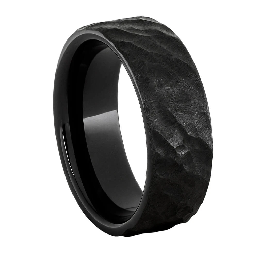 This black wedding band sports a one-of-a-kind hammered finish that is unique to each ring. This design is hand-finished one ring at a time, making each example different from the last.