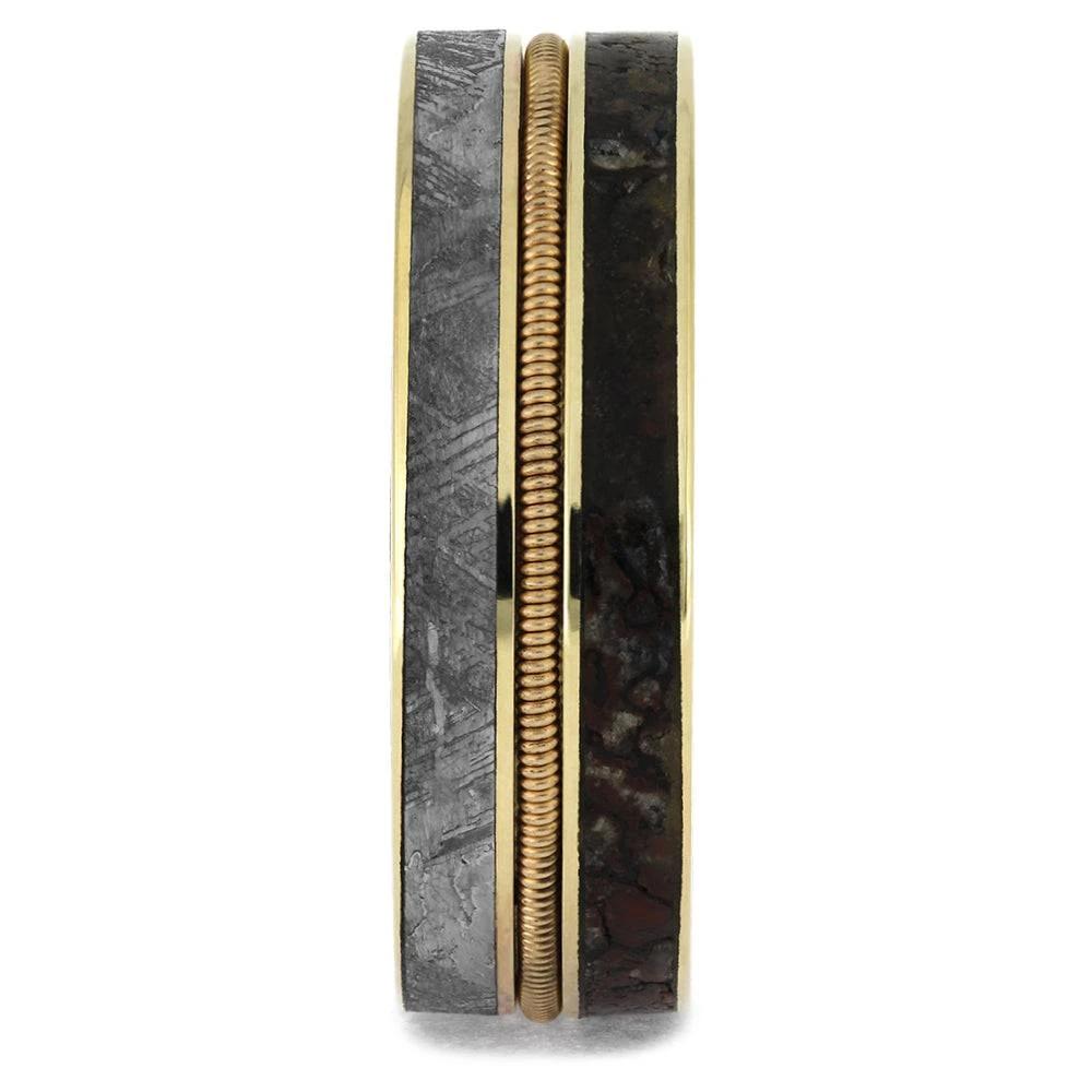 Perfect for the groom who loves music, this men’s wedding band features a guitar string inlay. On one side of this wood wedding band is Gibeon meteorite, contrasted by the fossilized dinosaur bone on the other side. Solid 14k yellow gold pinstripes and edges decorate the sides of this unique ring.