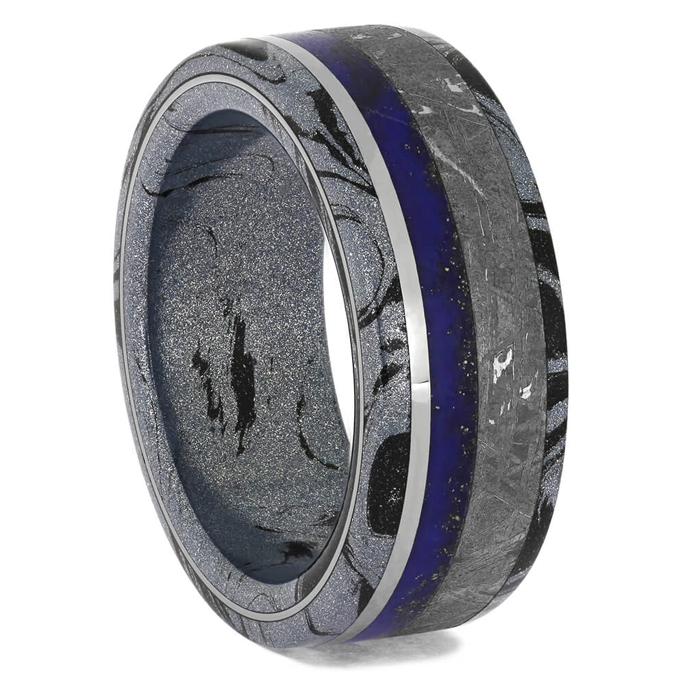 The Meteorite in this terrific mokume ring shows a fantastic Widmanstatten pattern. The ring’s beauty is maximized with two different shades of brilliant blue coming from the mokume gane and secondly the lapis lazuli. Subtly breaking up these wondrous patterns, for a touch of calmness, is a sleek titanium pinstripe.