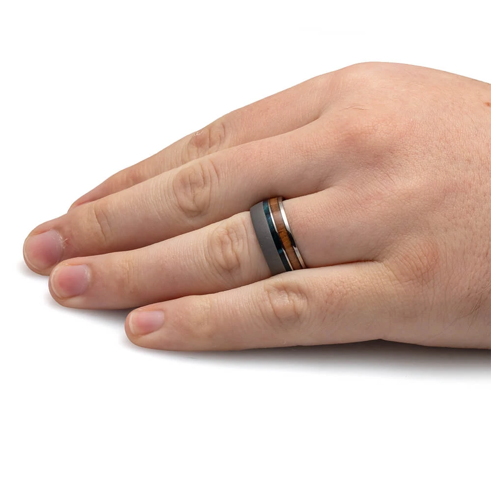 This custom wedding band is expertly crafted from titanium featuring a sandblasted texture, highlighted by inlays of blue box elder wood and sequoia redwood. A sleek titanium pinstripe enhances the wood’s natural elegance, creating a sophisticated piece that reflects a deep appreciation for nature.