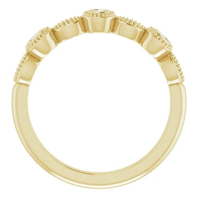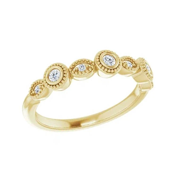 This dainty diamond band features a unique shape and milgrain edges that give it a vintage look. A total of seven round cut diamonds decorate the stackable or anniversary band. You could also pair this diamond ring with an engagement ring.