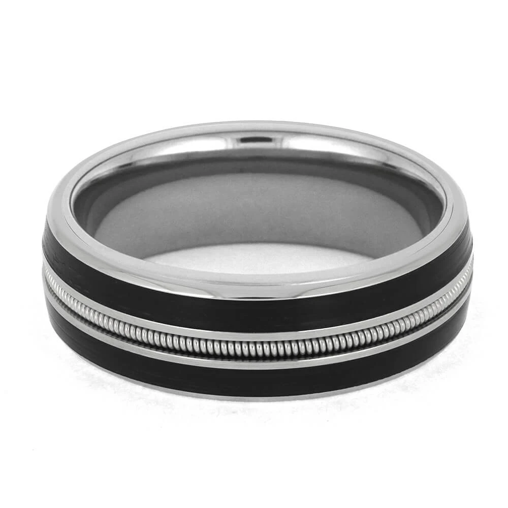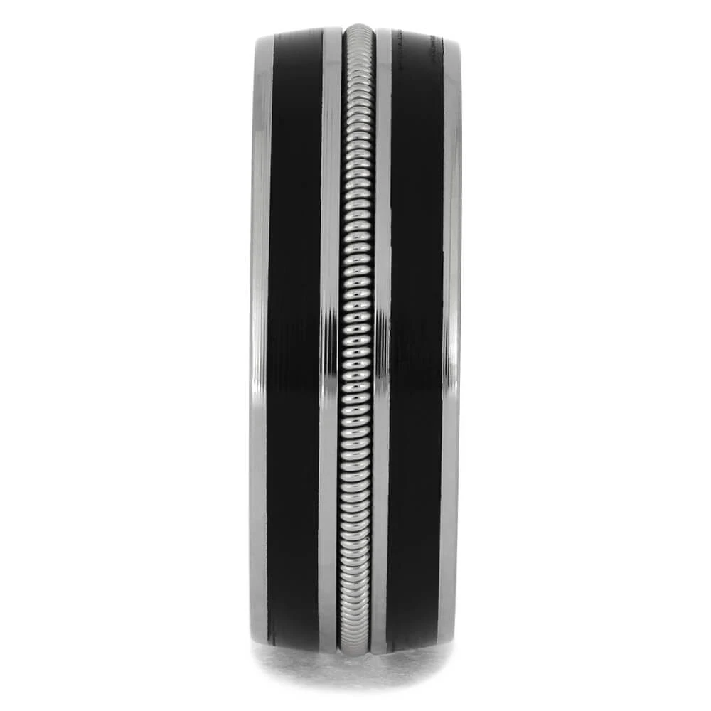 Declare your love for music with this vinyl wedding band for men. Down the middle of this titanium ring is a guitar string inlay, flanked by vinyl record inlays. Contact our custom design team and get a music-themed wedding band made for you or your audiophile husband!