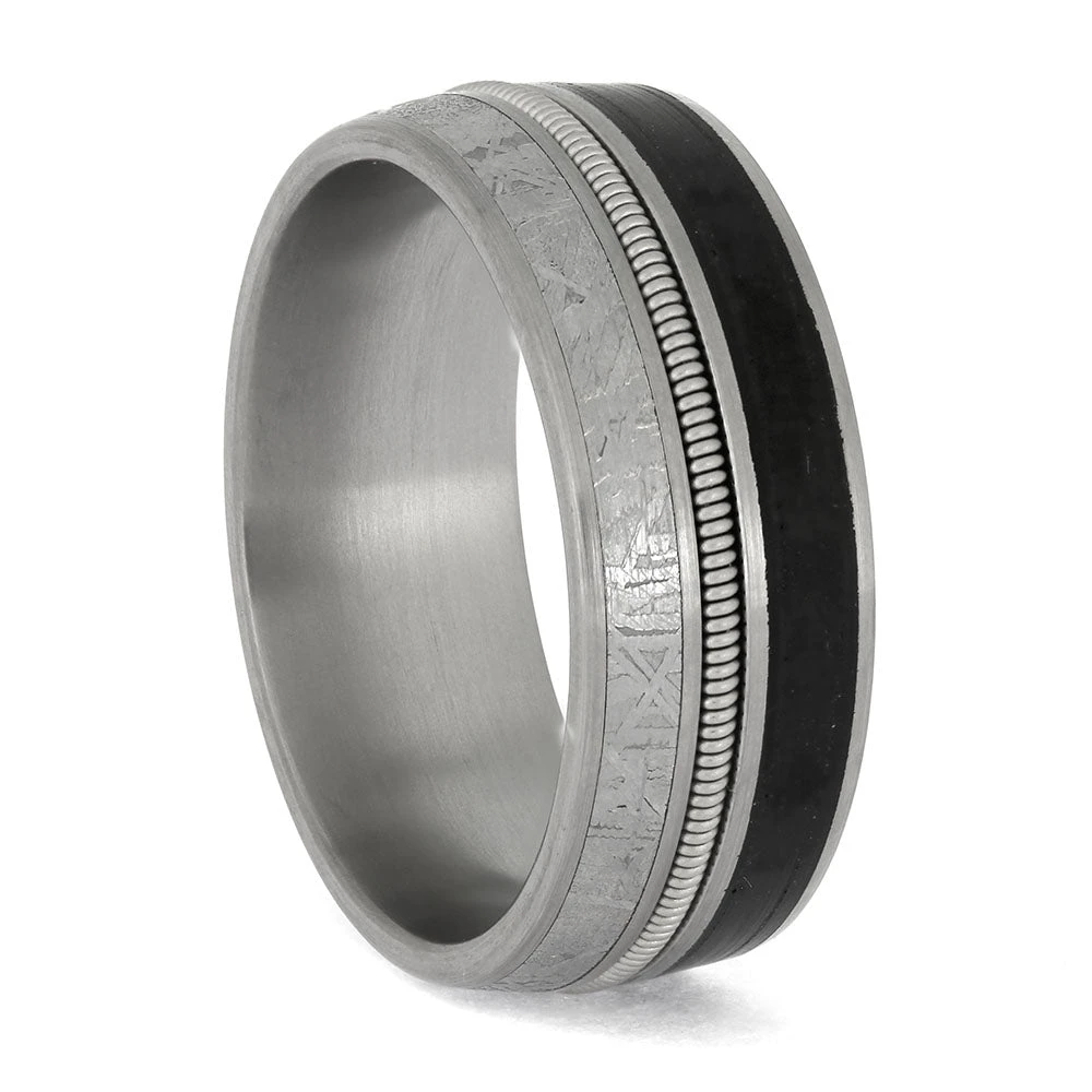 Authentic meteorite, as well as a guitar string and vinyl record, decorate the inlays of this unique wedding band from Jewelry by Johan. This ring is in stock in size 9.5 and ships in 1-3 days!