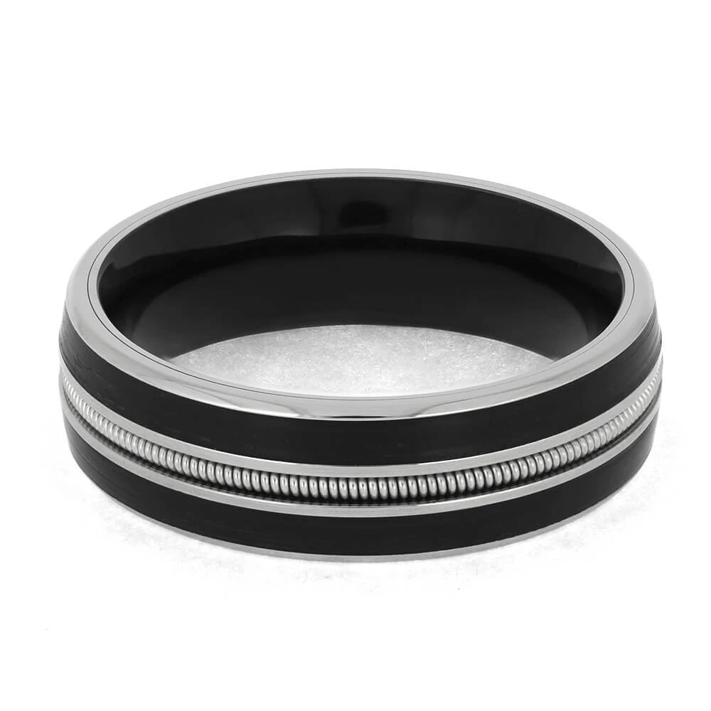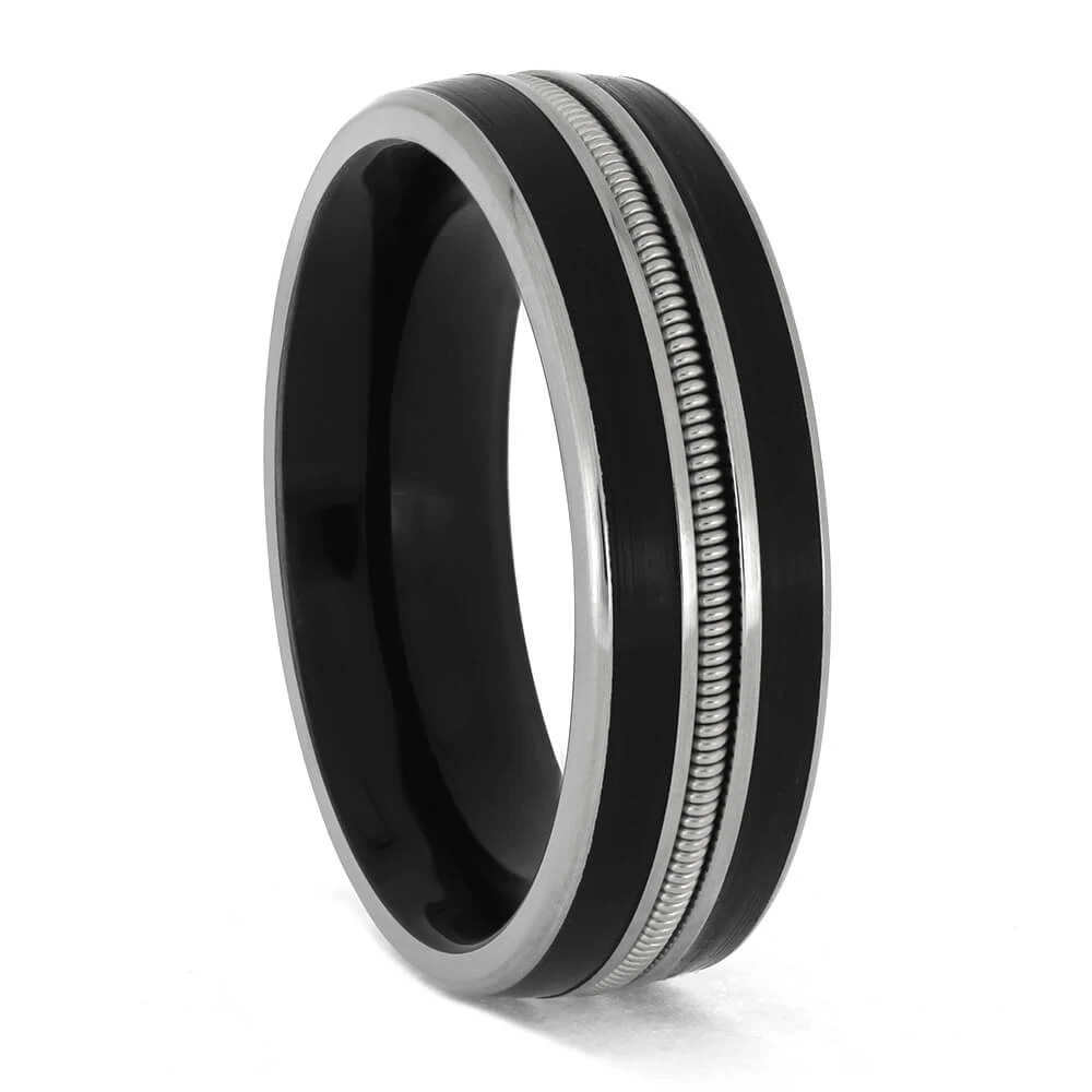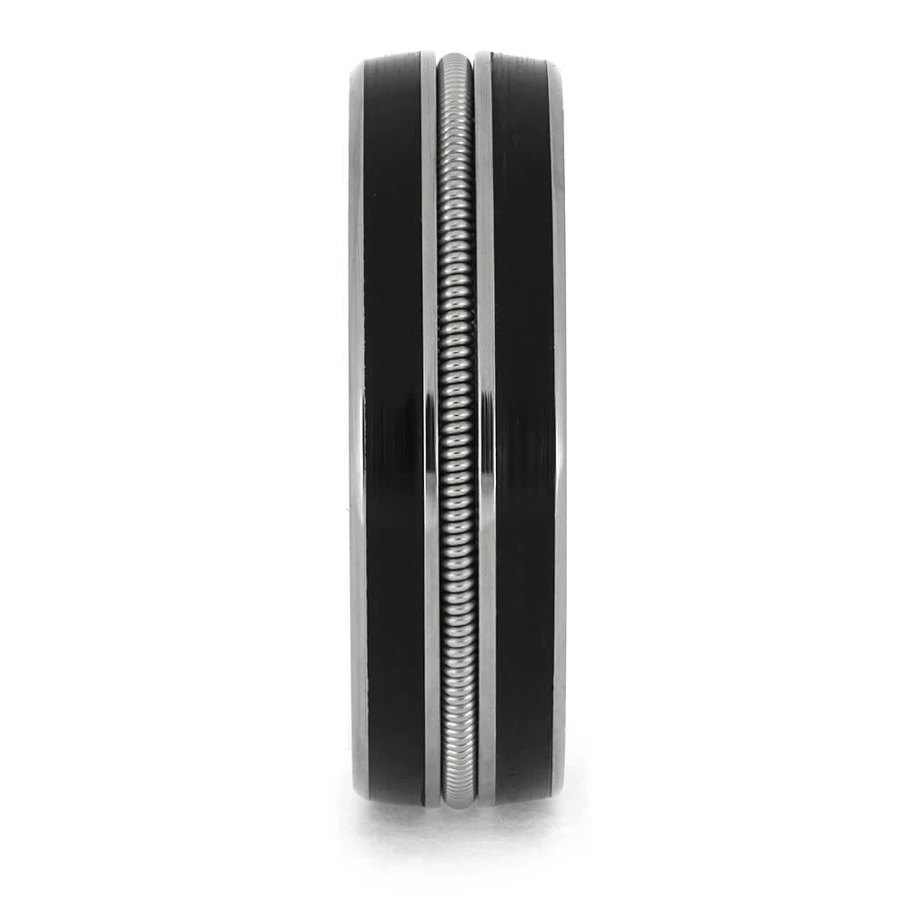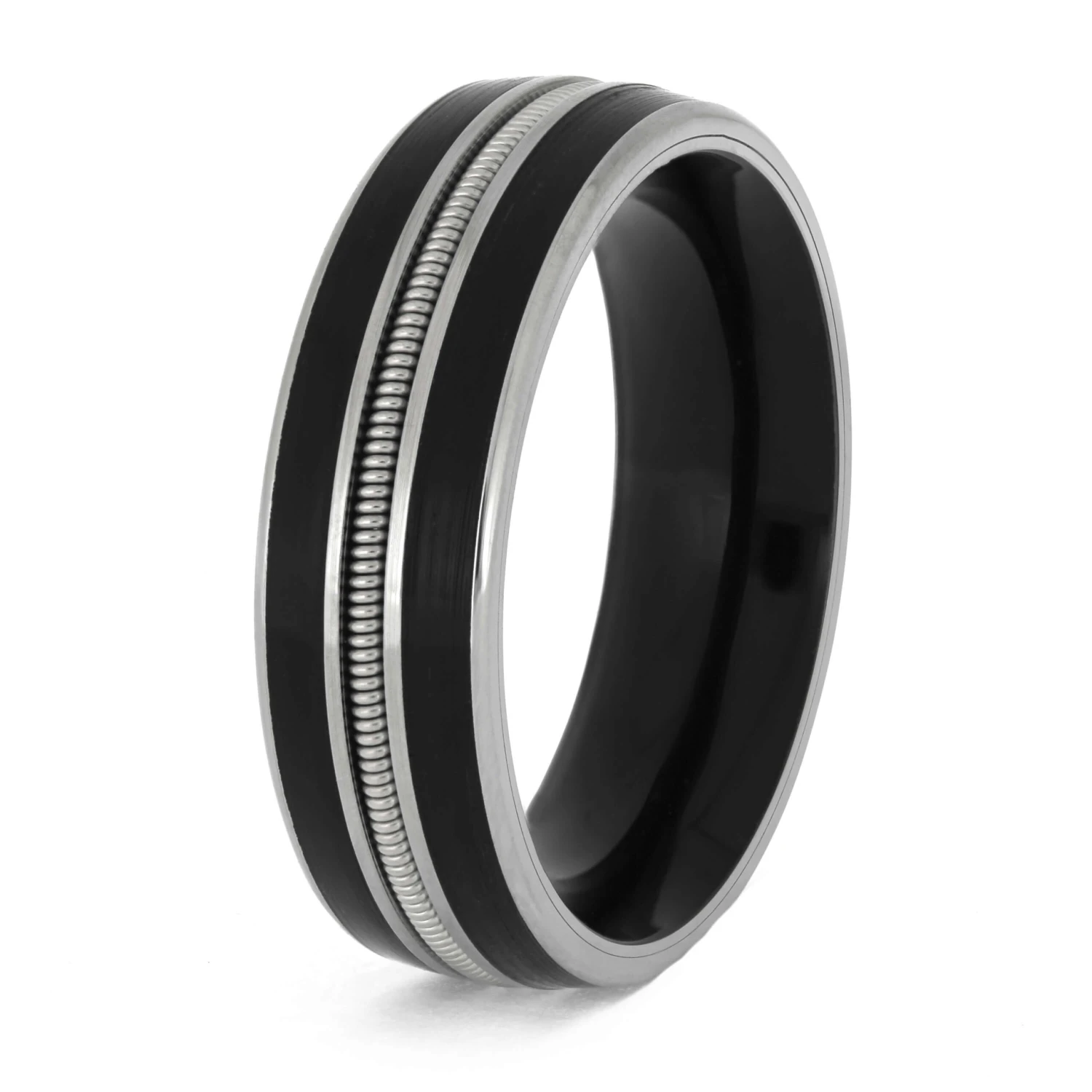 Celebrate your passion for music with this men’s vinyl wedding band. Crafted from titanium, the ring features a central guitar string inlay and vinyl record inlays on either side. The sleeve is adorned with black ebony wood for added comfort and style. Reach out to our custom design team to personalize your own music-themed wedding band today!