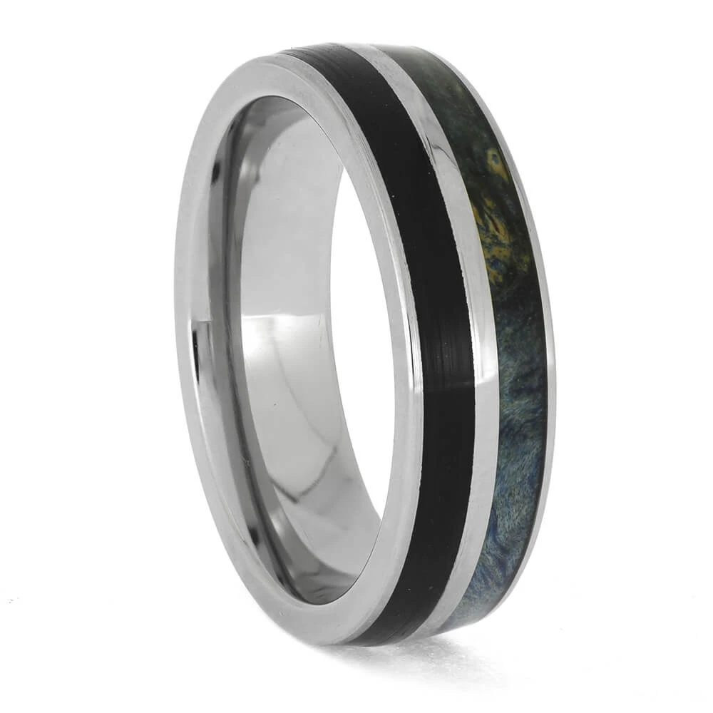 This distinctive men’s wedding band features a vinyl record inlay that contrasts elegantly with polished titanium edges. The ring’s sleek design combines blue box elder burl wood and a dark vinyl record inlay, giving it a modern and stylish appearance. It’s the perfect ring for music enthusiasts and those looking for a unique and fashionable wedding band.