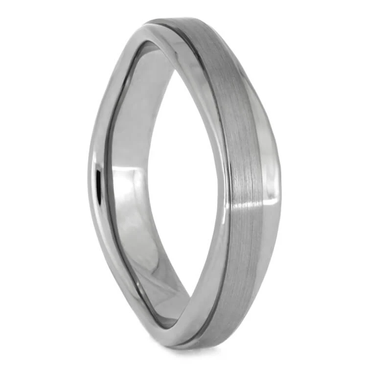Contrasting shapes and textures bring visual interest to this single-material wavy titanium ring. The ring’s band is polished to a mirror finish and curves from side to side, while the raised overlay runs straight over the middle and is brushed to a softer metallic sheen. This handmade jewelry is a simple yet sophisticated design that really shines in the little details.