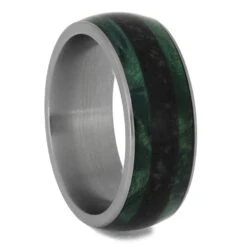 This meteorite wedding band has a bright pinstripe of natural maple wood. A sandblasted finish enhances the unique color of the wood by contrast.