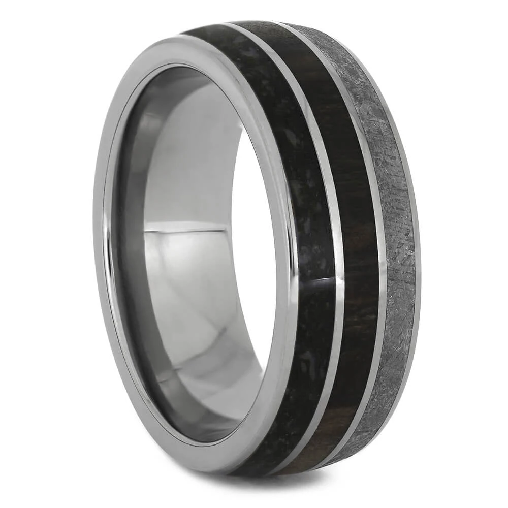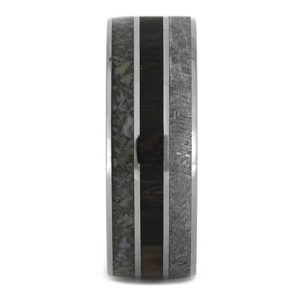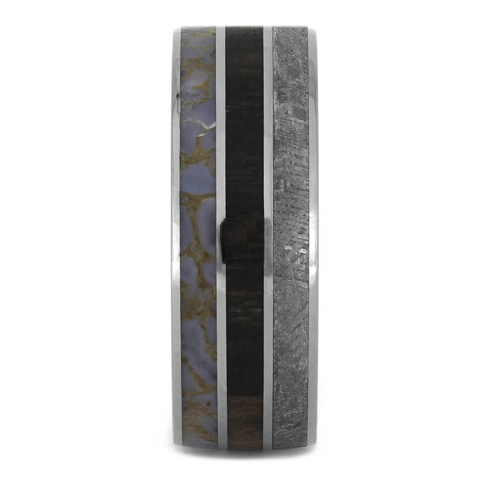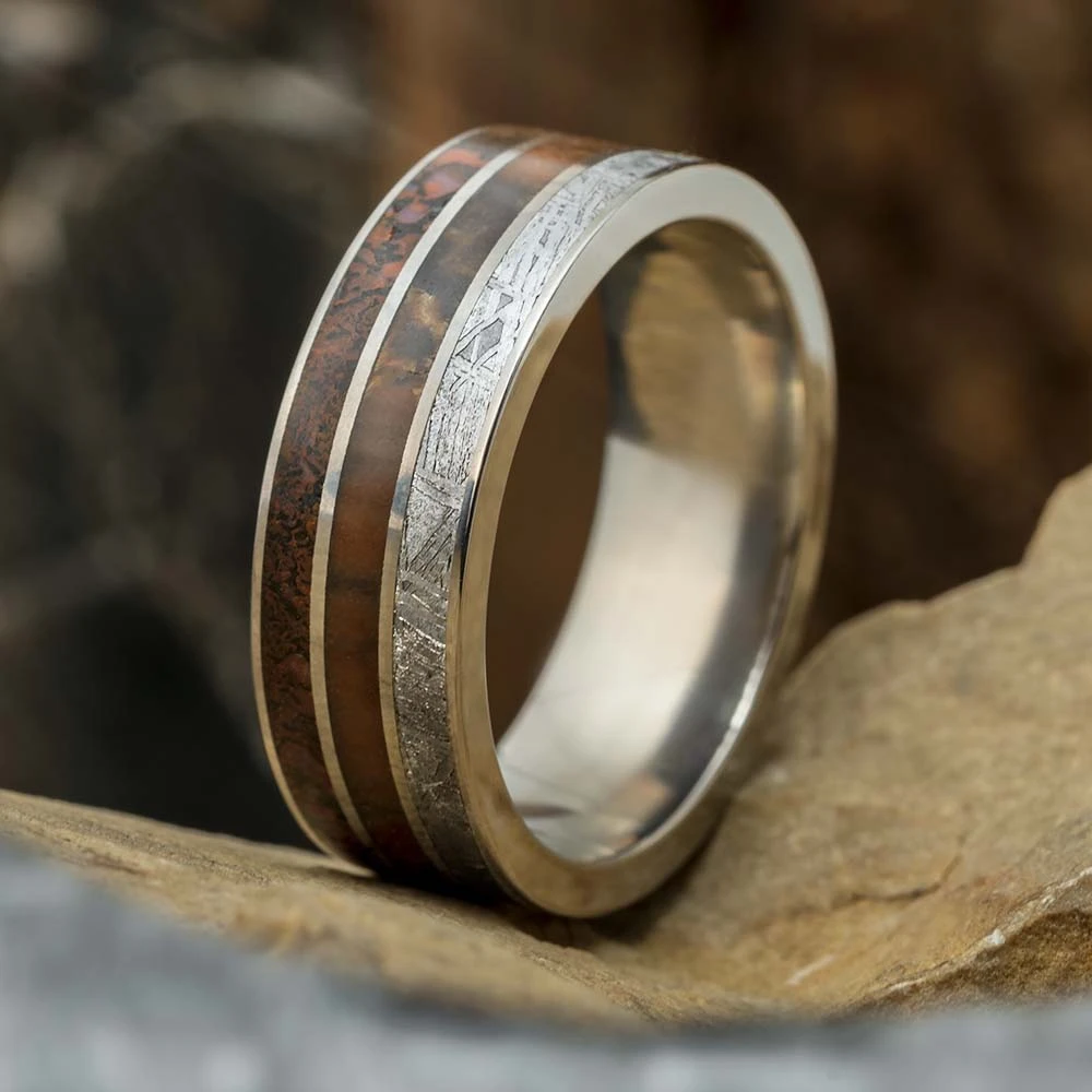 When it comes to wedding bands many begin to look the same. However, my rings go beyond the ordinary and boast a one of a kind nature. This wedding band holds a trio of inlays that are truly unmatched, meteorite, petrified wood, and dinosaur bone. Each element has its own unique pattern and origin. Get something special to signify your loving and commitment.