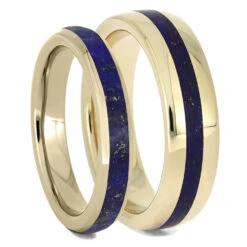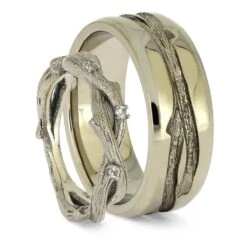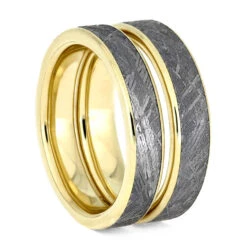 Aspen Wood Wedding Ring Set, Yellow Gold Moissanite Engagement With Meteorite Wedding Band