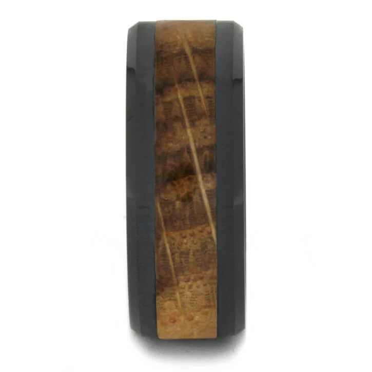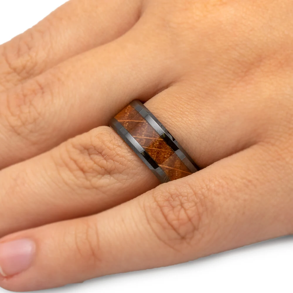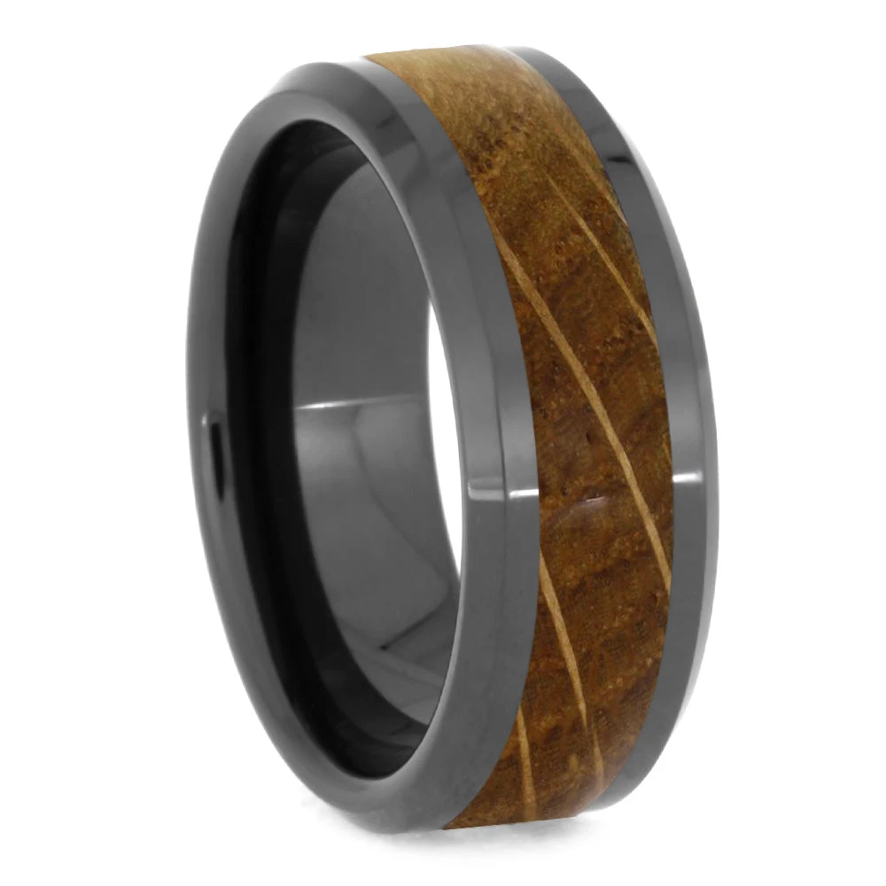 Say “I Do” with this oak wood wedding band made with an authentic whiskey barrel. This black ceramic ring has beveled edges and a comfortable fit sleeve. The beveled edges makes it look like the ring is cuffed to your fingers and will give a more masculine look.