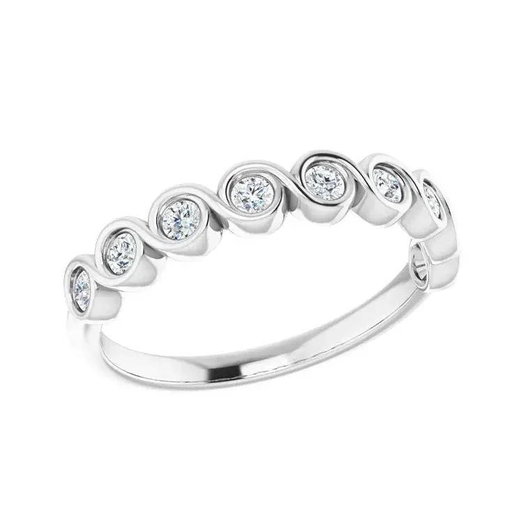 Expertly crafted in 14k white gold, this diamond anniversary band features a unique swirling bezel setting. Its versatile design allows for various styling options, whether worn alone, paired with an engagement ring, or stacked with other rings. The possibilities are endless with this stunning and elegant band.