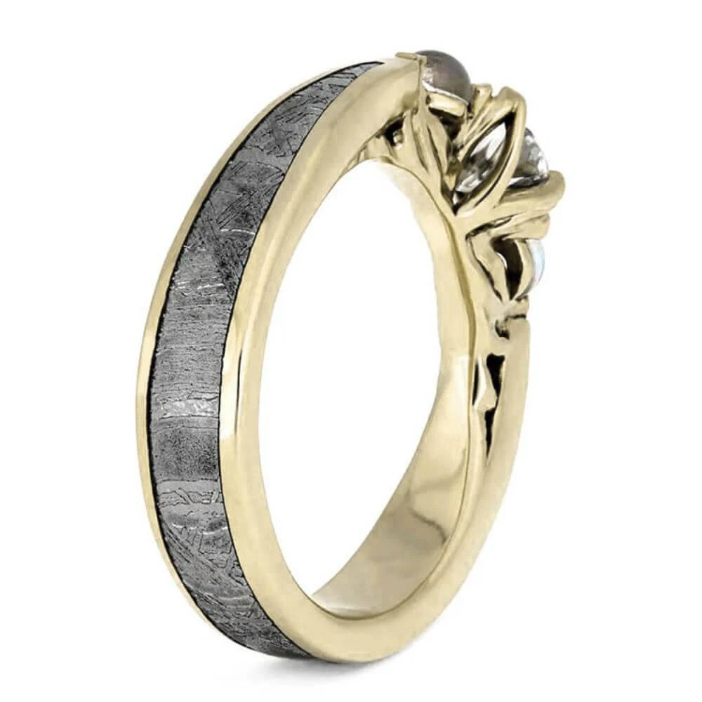 Utilizing a traditional three-stone concept, this 14k white gold engagement ring boasts the addition of meteorite and moonstones for a one-of-a-kind, celestial feel. The featured moissanite center stone is secured by floral-inspired prongs, emphasizing the surrounding shimmering moonstone cabochons. The cosmic theme is seamlessly integrated with a reverse-tapered shank, featuring a Gibeon meteorite inlay.