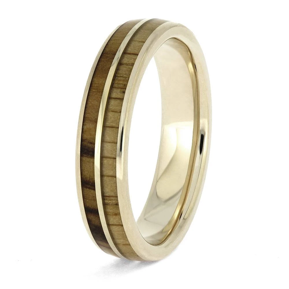 Discover the natural beauty of this elegant oak and olive wood wedding band. Expertly made in the USA with a rounded profile, this ring highlights the unique colors and textures of the twin wood inlays. Customize your ring with our selection of different wood inlays by contacting us for details.
