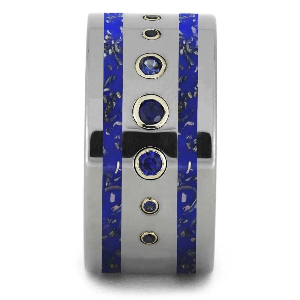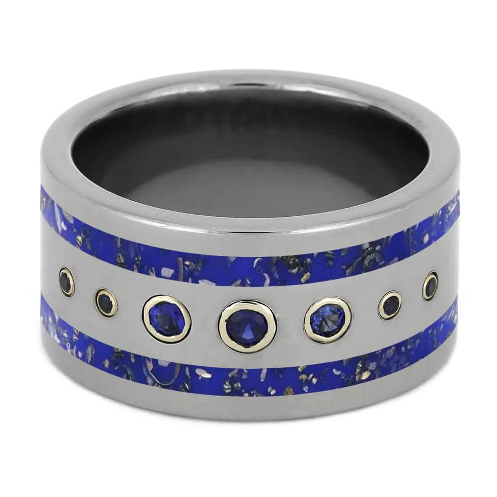 This wide titanium wedding band features several blue sapphires set in 14k white gold. On either side of the stones are stripes of matching navy blue stardust. If you’re superstitious, this blue wedding band could serve as your “something blue” that you bring to your wedding. Or customize this ring with a different color stones and stardust, if you’d prefer!