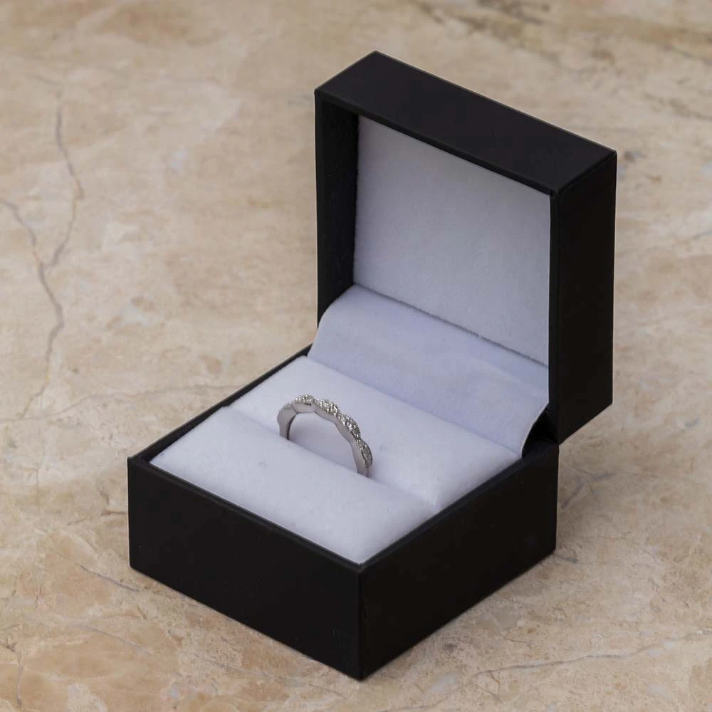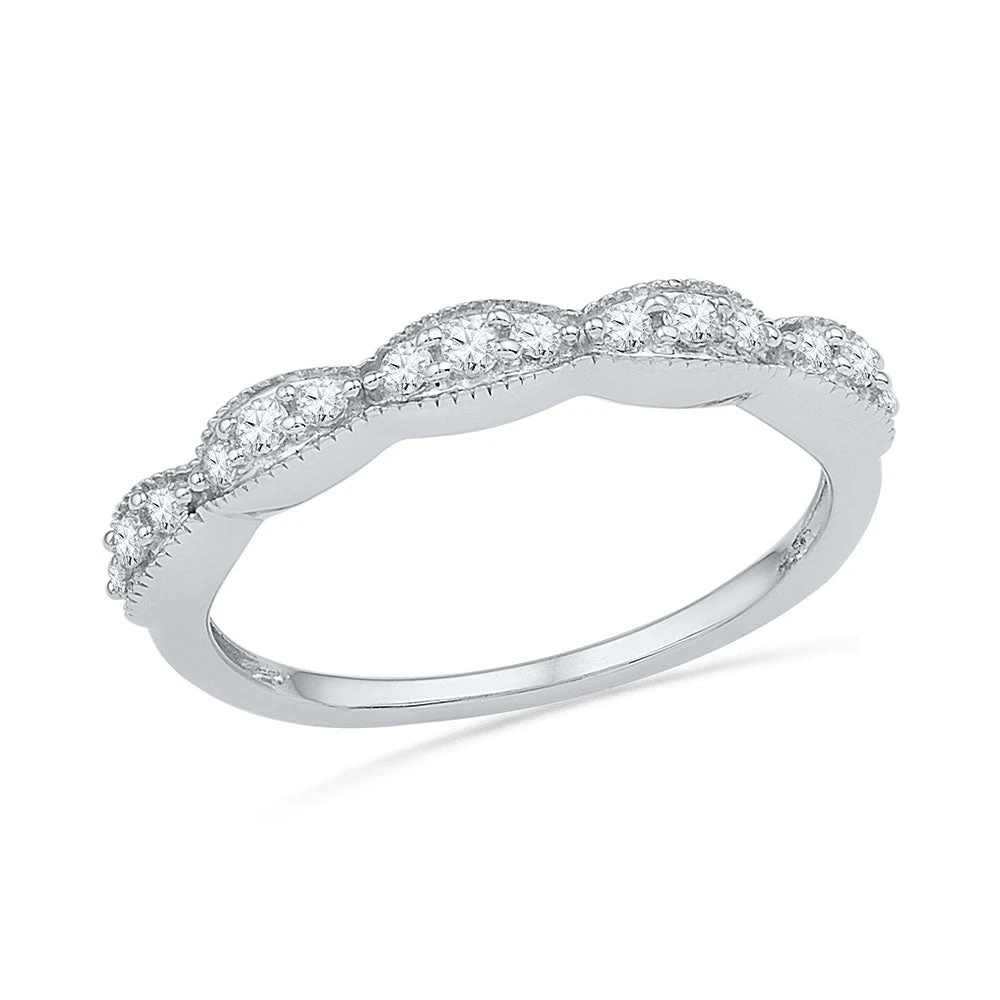 This women’s wedding band features sparkling 1/5 carat total weight of diamonds and displays an intricate milgrain design. This vintage-style wedding band is available in sterling silver or white gold.