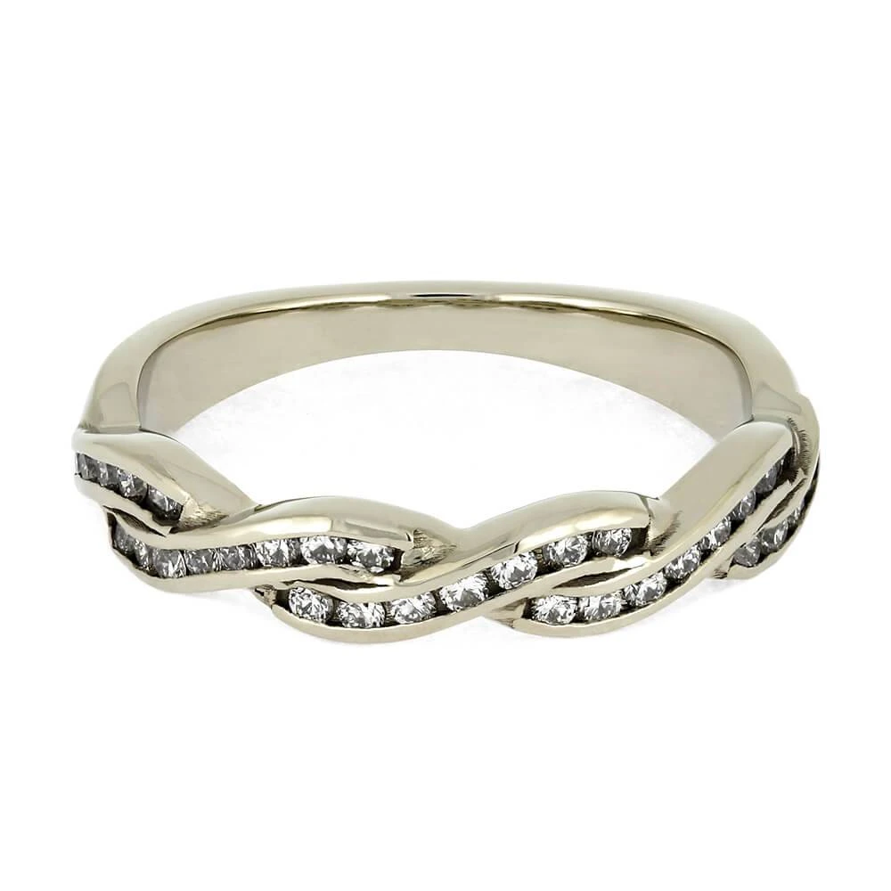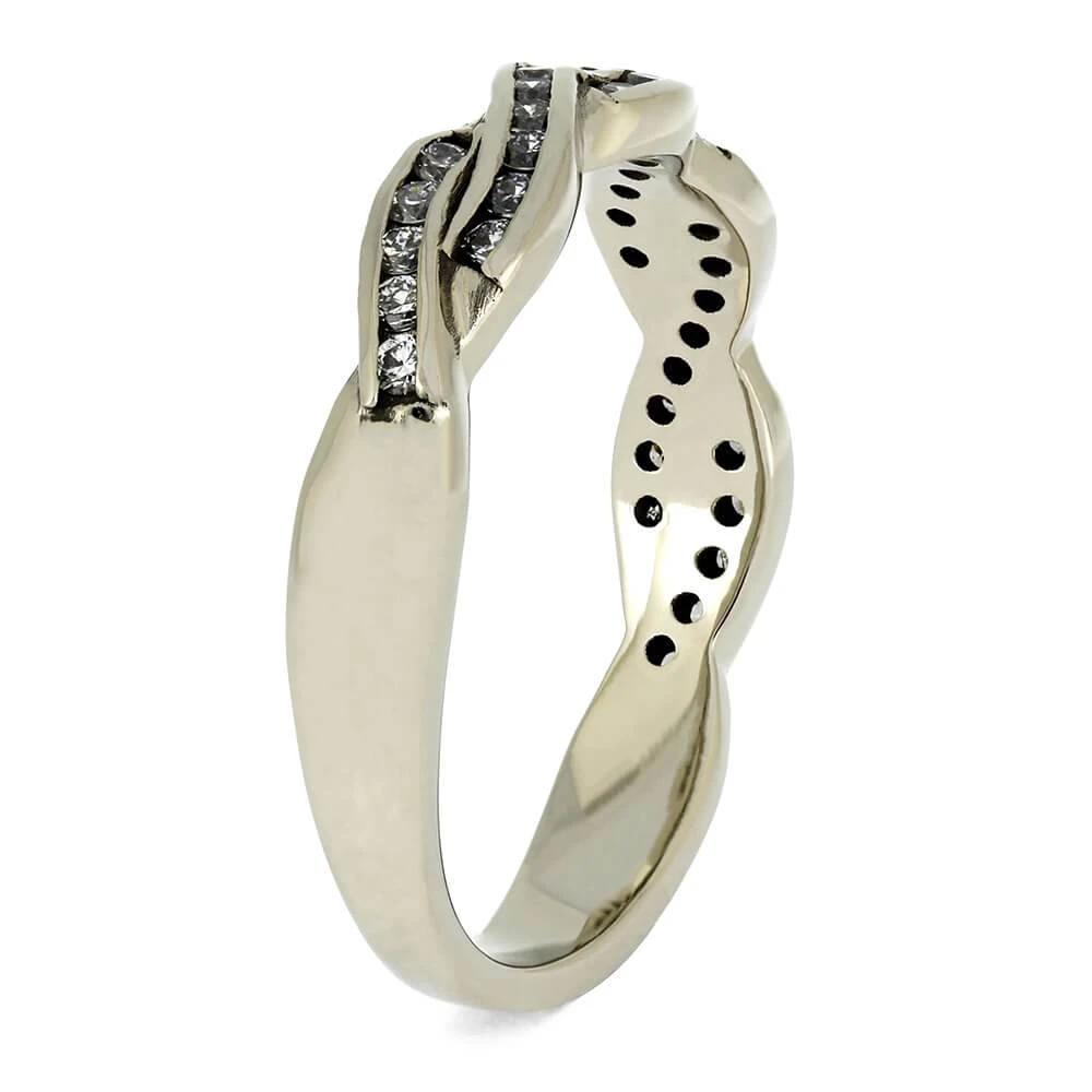 A channel of diamonds forms a twist in the center of this women’s 14k white gold wedding band. A polished finish gives this diamond wedding band a bright and clean finish.