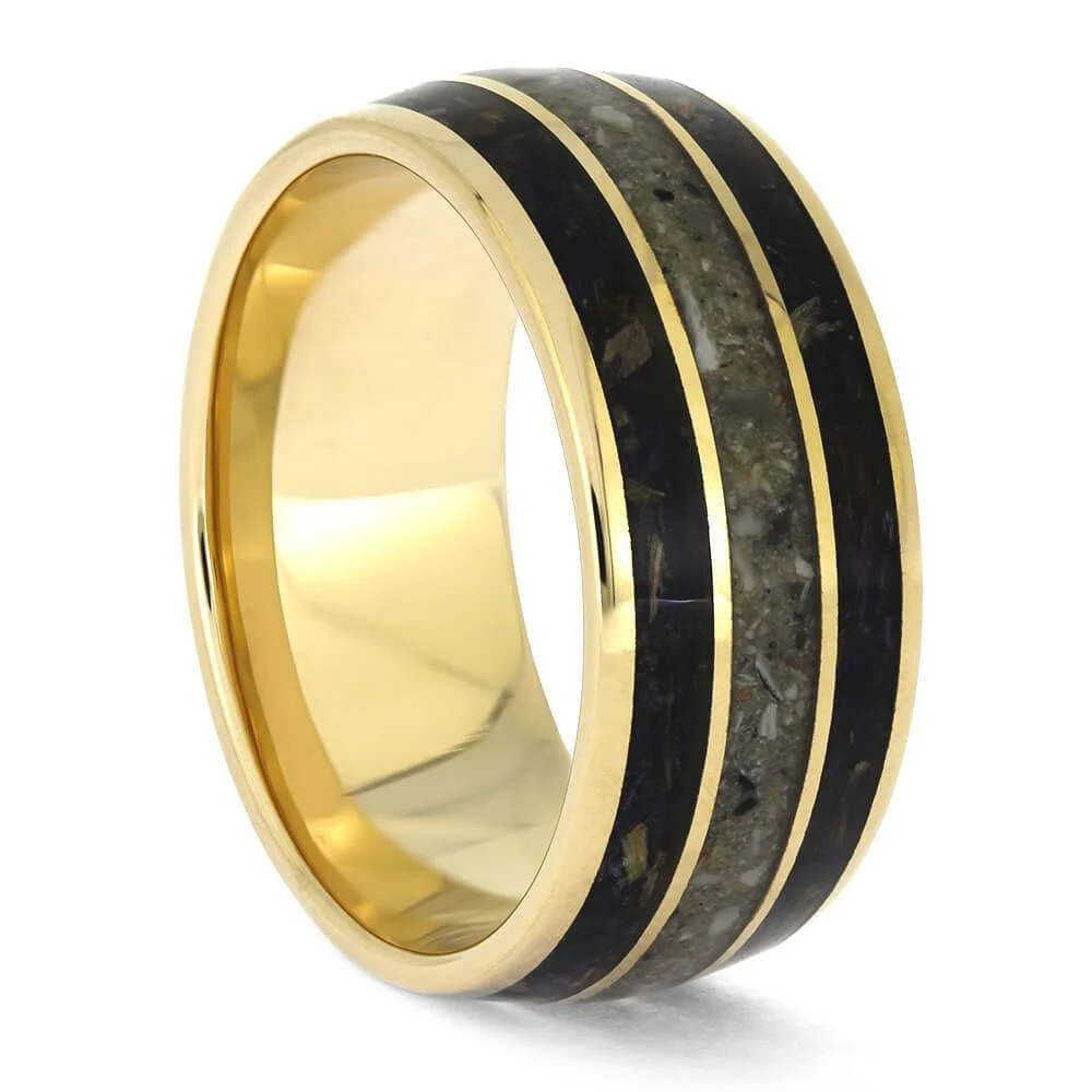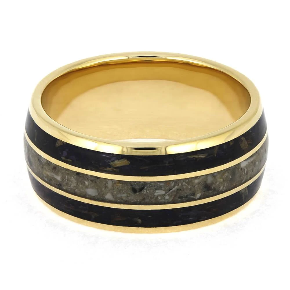 Honor your late companion with a 14k Yellow Gold memorial ring. This expertly crafted piece features two inlays of flower petals divided by the ashes of your pet. Simply supply the cremains and we will craft a personalized memorial ring.