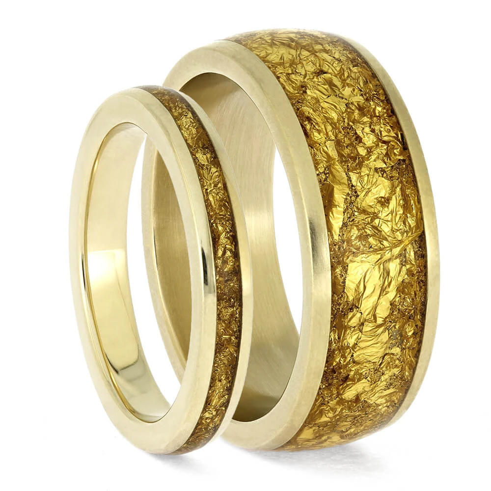 This exquisite yellow gold wedding band set will draw attention to you and your beloved partner. Two 14k yellow gold rings feature gold foil inlays that are waterproof, creating a unique, coordinated look unlike any other.